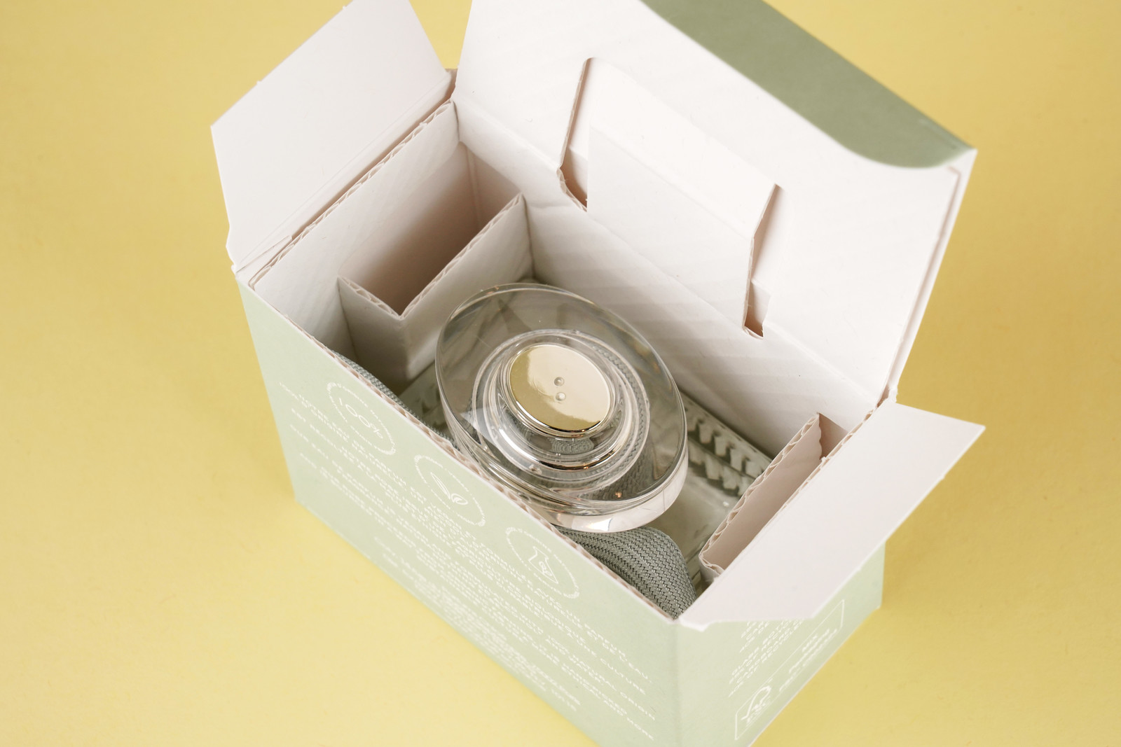 Suited to all major print and finishing techniques, James Cropper’s Rydal paper demonstrates superb reproduction of the graphic elements in the folding box design. The iconic Chloé brand marque is flawlessly enveloped by a distinctive sage green print that covers the outside of the box.